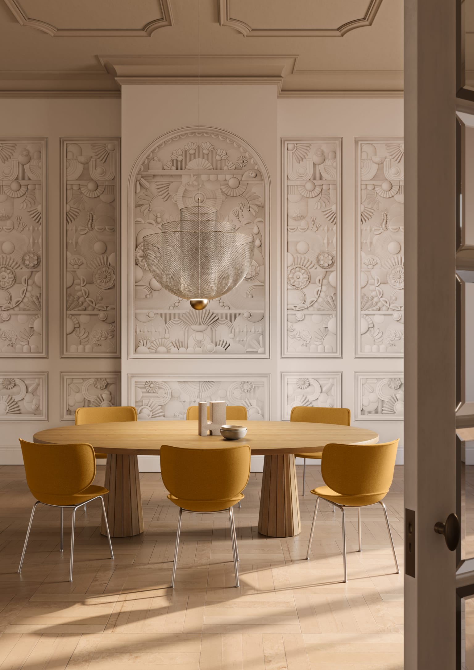 Dankzij het transparante materiaal straalt de Meshmatics kroonluchter een elegante, stralende, zachte gloed uit en creëert geen visuele blokkade.